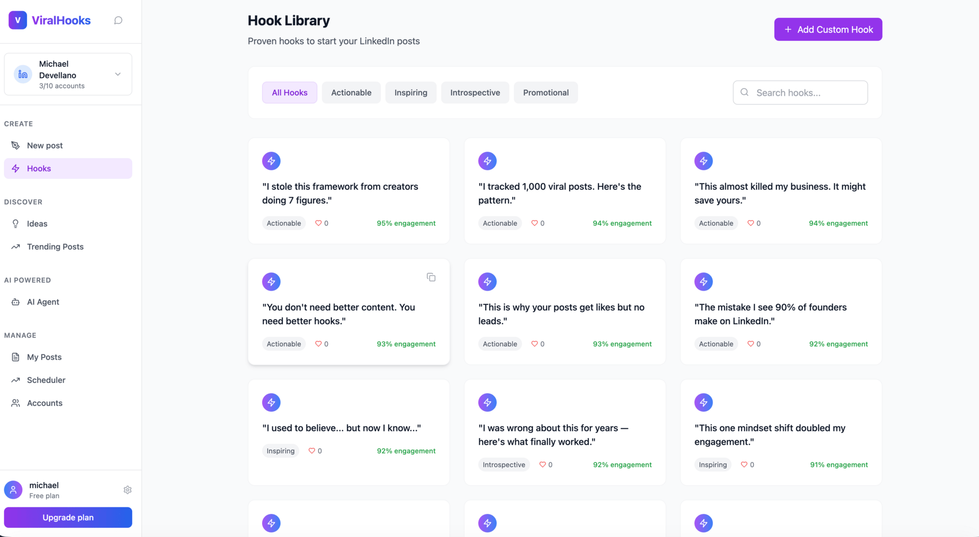 Viralhooks.work is a LinkedIn AI Agent that helps mange your content. You can generate content